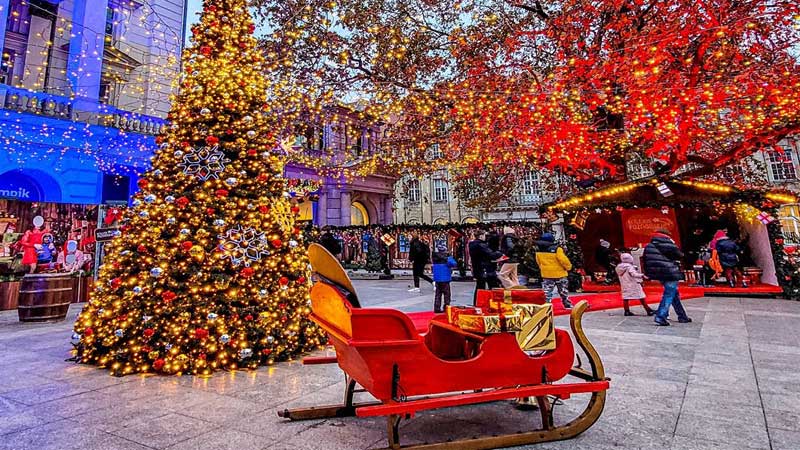 Hver aften breder duften af nybagte kager og grillede pølser sig gennem de brostensbelagte gader, og du kan varme dig med en kop varm vin eller kakao, mens du nyder lyden af julekor og levende musik.
