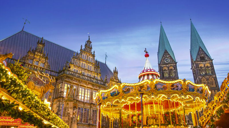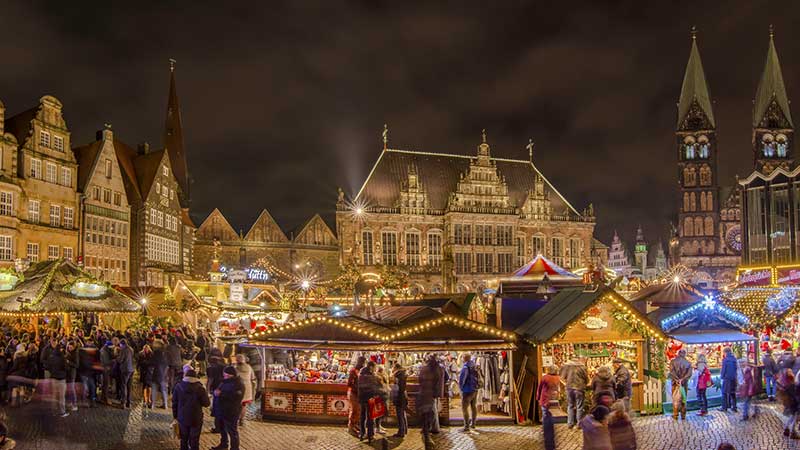 Midt mellem det historiske rådhus og de ikoniske bymusikanter popper op mod 170 juleboder op. Når du har suget en masse julestemning til dig, må du ikke snyde dig selv for en gåtur langs Weser-promenaden. Få minutters gang fra rådhuspladsen ligger oplyste skibe som perler på en snor og skaber et eventyrligt lysarrangement på floden – det såkaldte ’Schlachte-Zauber’.