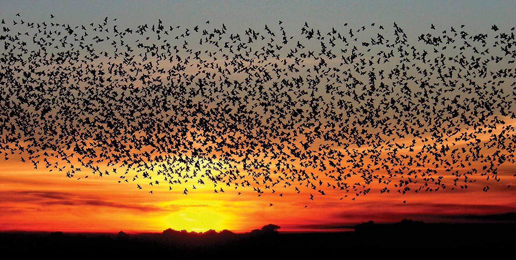 Lige før stærene går ned på jorden for natten, tegner de store flokke fascinerende mønstre på himlen - det kalder man Sort Sol.